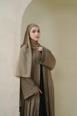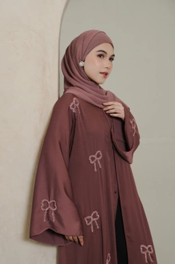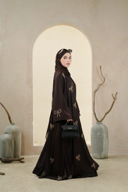 Detail payet handmade bermotif pita menjadi signature touch yang menghadirkan kemewahan ala khaleeji, berkilau lembut seperti cahaya malam di gurun. Full kancing di bagian depan membuatnya serbaguna; dikenakan sebagai abaya klasik atau outer layering bernuansa modest chic.